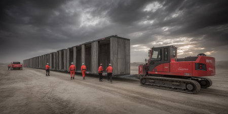 A group of construction workers in safety gear transports heavy equipment on a construction site under overcast skies, highlighting teamwork and industrial operations.