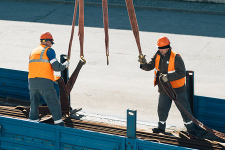Two slingers hook cargo to slings in back of truck. Real workers unload cargo. Slingers in construction helmets and vests at work on sunny day. Production background.