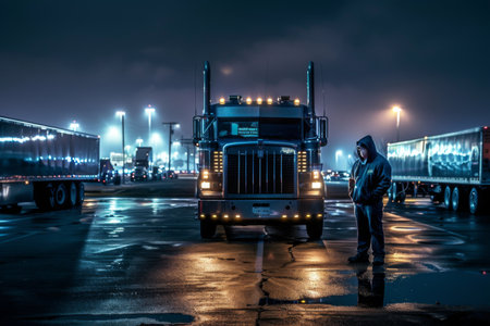 Beneath dim city lights, a solitary figure in a hoodie stands close to a massive truck, reflecting on the wet pavement. The ambiance captures a sense of solitude and contemplation.