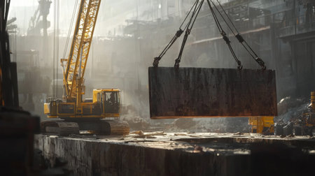 A massive yellow crane carefully lifts a heavy metal slab at a bustling industrial site, surrounded by debris and mist. The early morning light casts an atmospheric glow over the worksite.