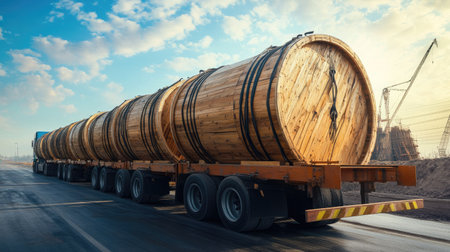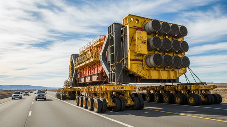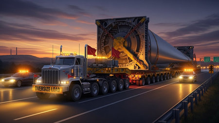 A truck carrying oversized cargo escorted by police. AI generated illustration