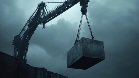 A dramatic scene of an industrial crane lifting heavy cargo against an overcast sky, showcasing the power and scale of maritime operations in a shipping harbor.