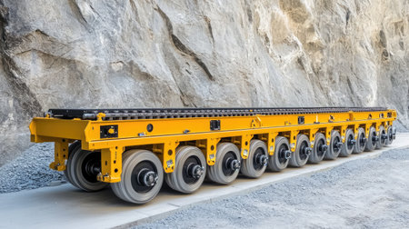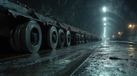 Heavy-duty rollers beneath the conveyor belt guiding material through narrow mine walls