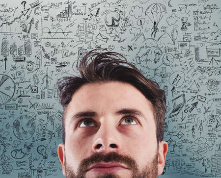 Businessman is looking up at a hand drawn thought bubble above his head, symbolizing questioning, messaging, and the process of brainstorming and problem solving