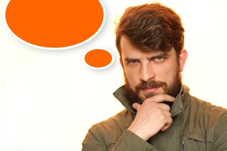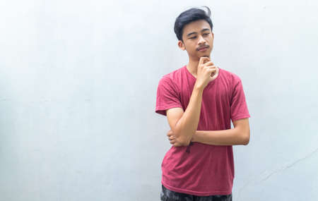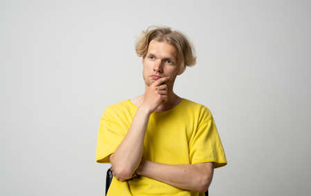 Portrait of thoughtful young man who looks away and touching his chin and weighs the pluses and minuses of the offer isolated on white background with copy space.