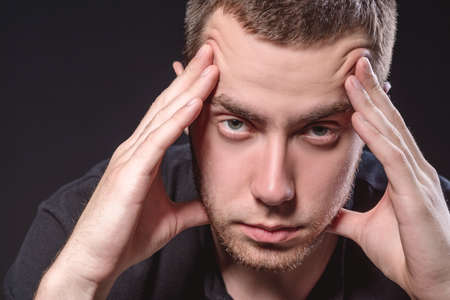 Young handsome man in a black shirt sits and holds his head on a black background. Experiencing stress, pain