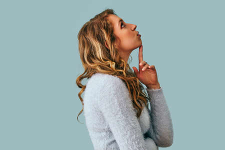 portrait of beautiful young pensive thoughtful woman with long curly hair looking away