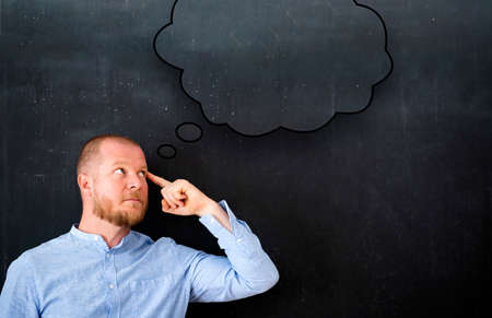 Casual man thinking with question mark and hand drawing sketch bubble on blackboard background. Choice, problem and solution concept
