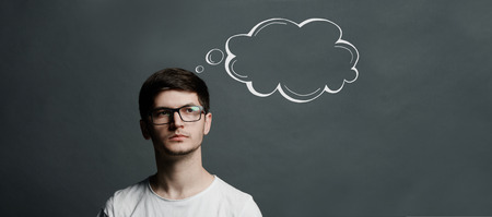 Thinking man with cloud thought sketched above his head, thinking bubble icon. Man thinking about a problem concept. black background.