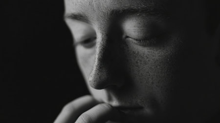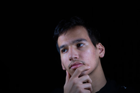 A young man contemplates life with a thoughtful expression, hand resting on his chin in a striking black and white backdrop that emphasizes mood.