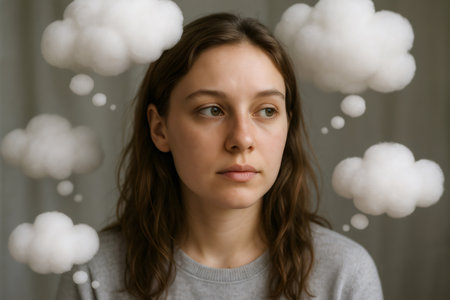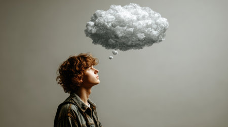 Pensive young woman surrounded by thought bubbles, illustrating her ideas and creative visions while contemplating possibilities and solutions