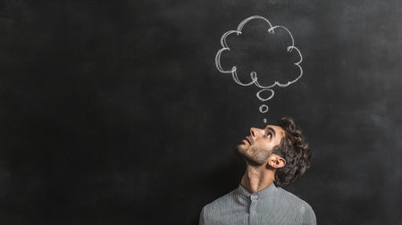A thought bubble drawn on a chalkboard above a person's head representing ideas or thinking.