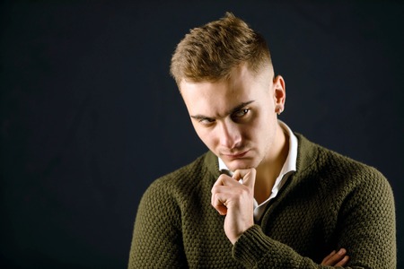 Portrait of an emotional handsome young man, on a black background in the studio, who stands in a brooding pose. Expression of emotions and feelings