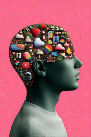 Artistic representation of a human silhouette with a brain filled with various icons and symbols, illustrating the intersection of creativity and technology in modern life