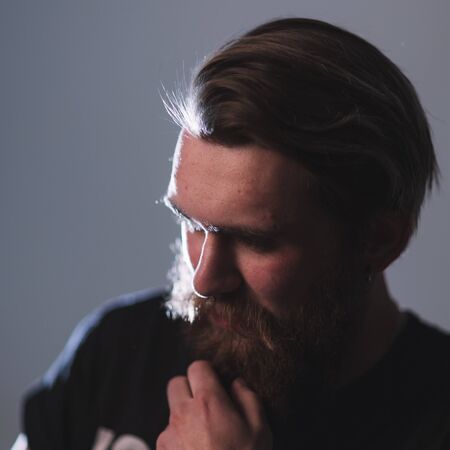 Portrait of a bearded guy in black, twenty-five years old, holds his fingers to his temple. On a gray background. The background to depression