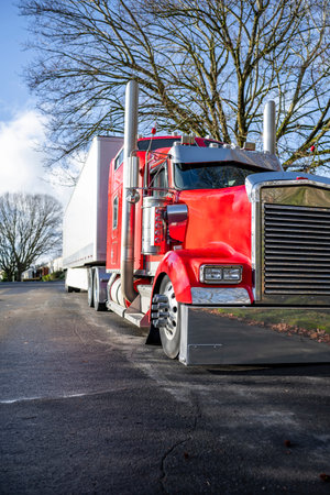 Big rig bonnet diesel industrial wet red semi truck chrome accessories standing on the street road parking in raining weather waiting for cargo load for next delivery