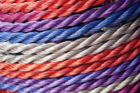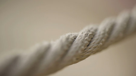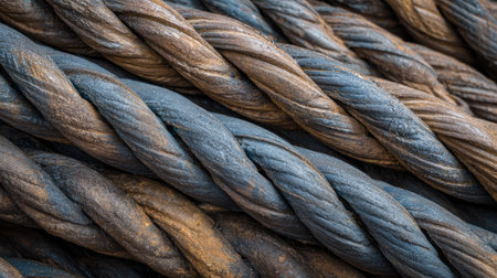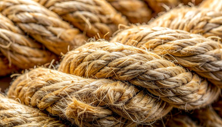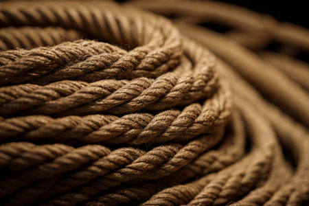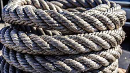 An up-close perspective reveals the complex twist of a marine rope. The image highlights the ropes textured surface, essential for secure grip. AI generation