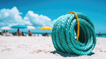 A polyethylene rope roll on a sandy beach, with beachgoers and umbrellas in the background.
