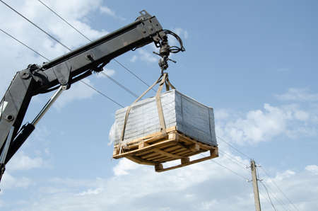 Unloading paving slabs from a truck. Men unload paving slabs using a manipulator.