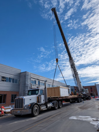 A crane is lifting building materials from a truck at a construction site, showcasing the logistics of material delivery under a bright blue sky.