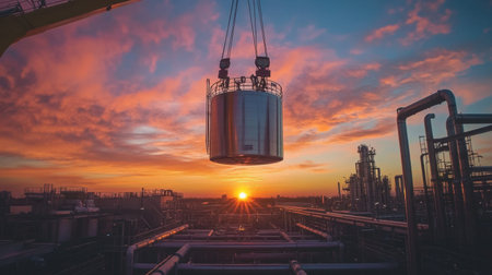 A stunning industrial scene captures a vibrant sunset with a crane lifting a steel tank. Colorful clouds reflect the beauty of an energetic landscape filled with machinery.