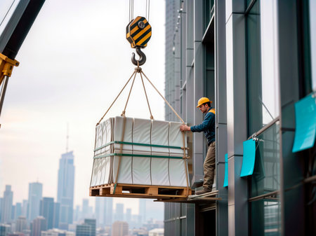 Construction worker guiding a crane lifting a pallet onto a skyscraper.