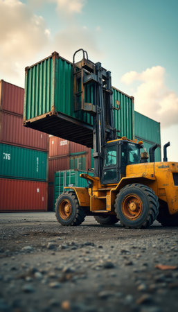 Heavy-duty forklift lifting a shipping container