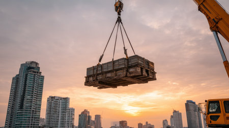 A crane is lifting a heavy load of construction materials against a captivating city skyline at sunset, creating a stunning scene filled with dramatic clouds and golden light.