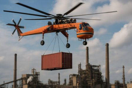 Orange helicopter transporting a cargo container above a refinery, highlighting the intersection of industrial operations and aerial logistics
