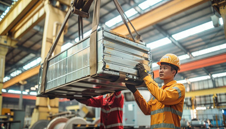 A crane in a factory showcases precise lifting of a metal box, demonstrating engineering expertise in action