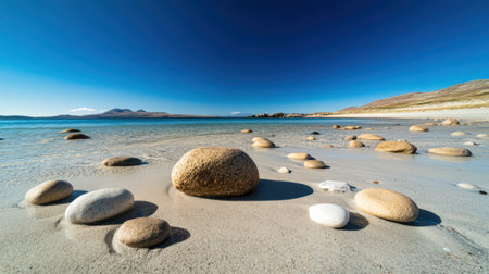 A remote empty beach with large rocks and smooth pebbles scattered across the shore, under a clear blue sky.