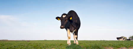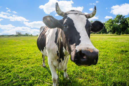 Animal. black and white cow swears on a field covered with grass on a bright day the blue sky is covered with clouds. Pets. Cattle grazing. The farm.