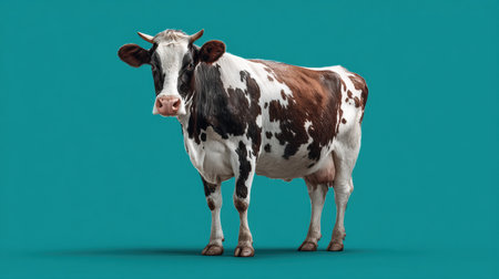 A striking dairy cow stands still, featuring a unique pattern of black and white spots, set against a bright teal background, emphasizing its natural beauty.
