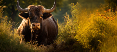 Nature Photography of a cow peacefully grazing in a green meadow as the sun begins to set.