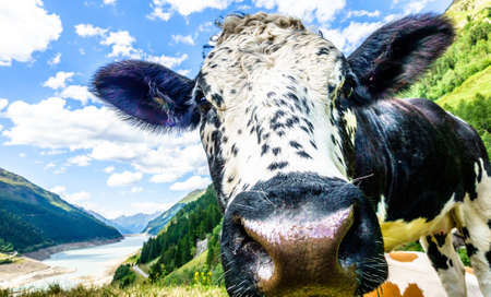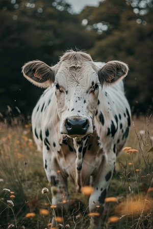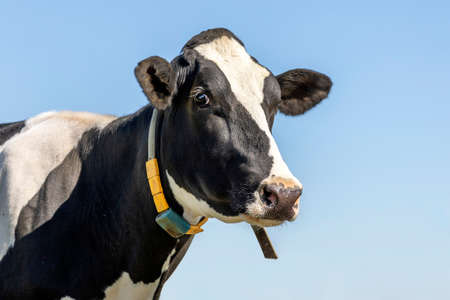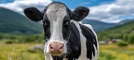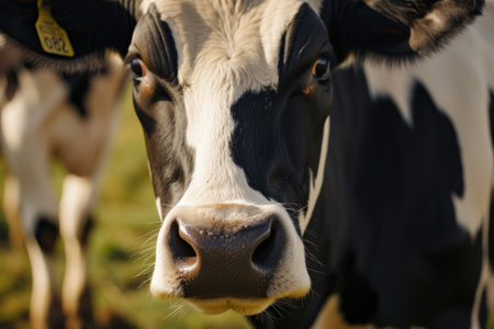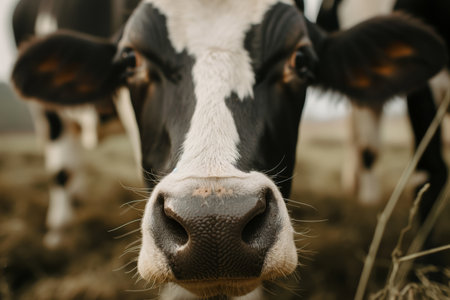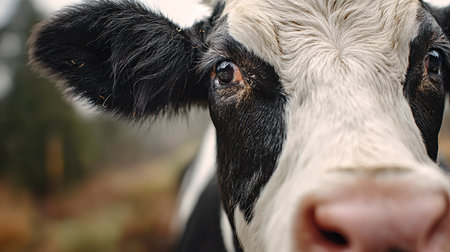 black and white cow portrait farming animal concept picture looking at camera staying in rural outside space on blurred unfocused nature background