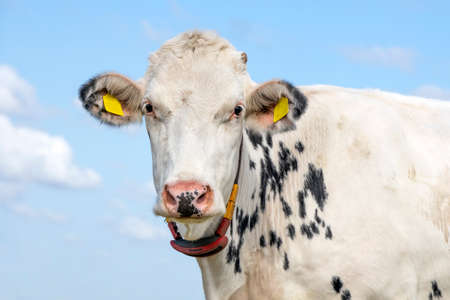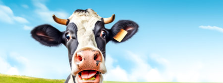 Long banner Cow portrait isolated on white background. Spotted black and white cow looking in front of white background. Farm animals concept.