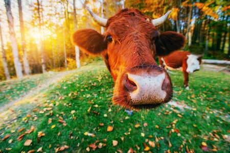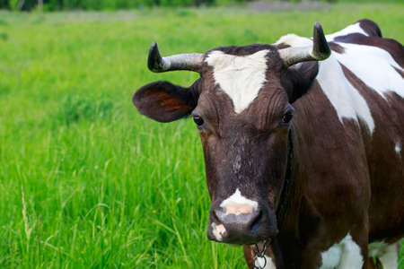 Funny cow grazes on a green lawn. Full face cow portrait. Cow farm.