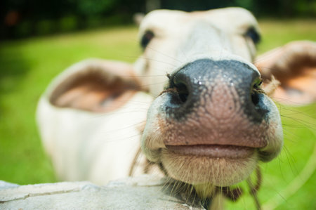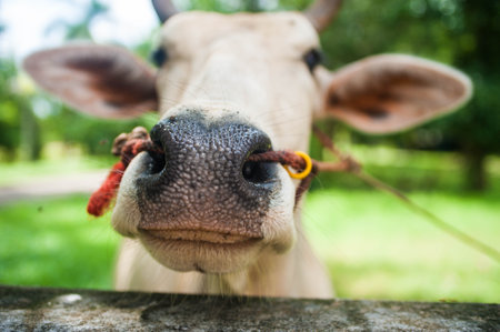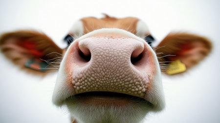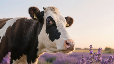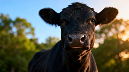 Detailed view of a cows face, showcasing soft fur textures lit by warm sunlight amidst a blurred farm background, creating an elegant rural atmosphere.