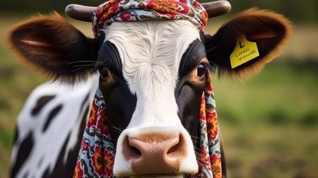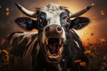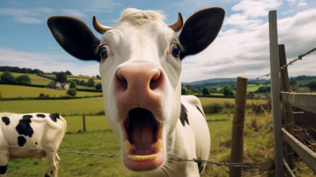 a cow, with expressive body language and exaggerated expressions, takes center stage in this uhd image. the fisheye effects add a unique touch, while strong facial expressions capture the cow's personality. rendered in unreal engine, the photo showcases selective focus, highlighting the cow's ability to make the world go round. ai generated