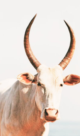 A gentle white bovine with prominent horns surveys its surroundings, emerging over a vivid turquoise barrier amid lively yellow and aqua hues.