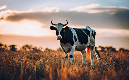 Black and white cow grazing in the meadow at sunset. Rural landscape.