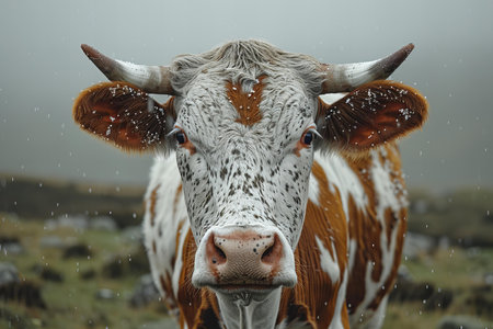 A lone cow stands beneath dramatic clouds in this stark monochrome image Minimalist and evocative, it emphasizes the fur's texture and expressive eyes Contrasting light and form capture a timeless, rustic scene, blending artistic expression with the simple majesty of nature A compelling rural portrait AI Generative