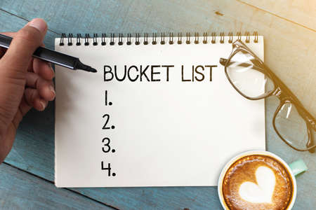 Pen,trash paper,sunglasses, and notebook written with Bucket List on wooden background.
