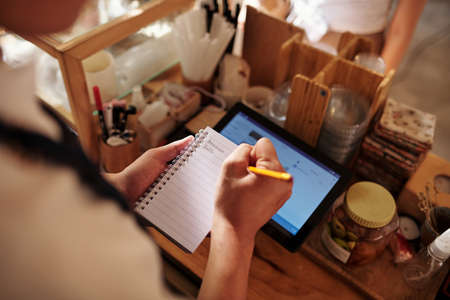 Young person writing numbers and formulas in a small notebook - Female holding scrapbook while calculating and analyzing data - Concept image for management and finance