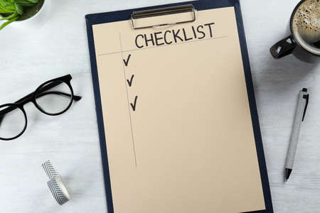 Clipboard with inscription Checklist, cup of coffee and eyeglasses on white wooden table, flat lay
