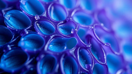 Macro close up of water drops on blue plastic sponge background.