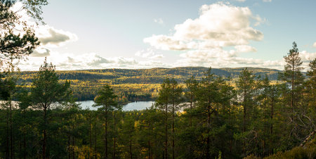 Lush autumn trees cover rolling hills, reflecting golden hues on a peaceful river below. Sunlight highlights the foliage, creating a warm and inviting scene under a dynamic sky. Captured in Finland, Europe.