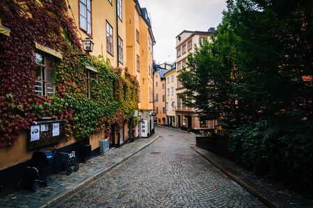 Picturesque cobblestoned street with colorful houses in Sodermalm in Stockholm
