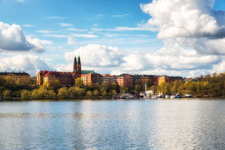Typical Swedish houses on the waterfront on a sunny morning. Stockholm. Sweden
