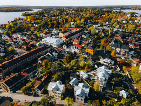 Scenic aerial view of small villages surrounded by forest near Porvoo in Finland